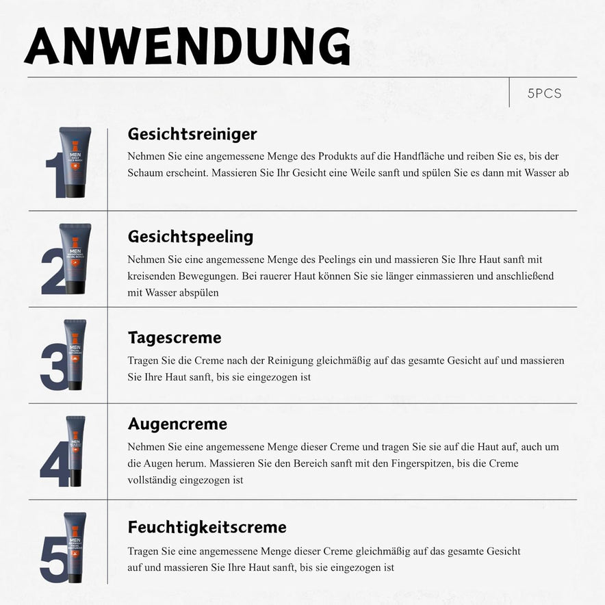 - Alles-in-einem Männer Pflegeset: Unser Männer Gesichtspflege Set enthält alles, was Sie für eine vollständige Hautpflege-Routine benötigen: Gesichtswäsche, Peeling, Augencreme, Tagescreme und Feuchtigkeitscreme. Ideal für Männer, die sich eine einfache, aber effektive Pflege wünschen – für glatte, straffe und gut gepflegte Haut