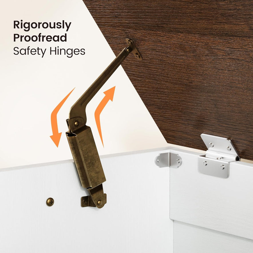 Die Sitztruhe verfügt über zwei hochwertige Sicherheitsscharniere, die ein sicheres Öffnen und Schließen gewährleisten und Ihre Gegenstände zuverlässig schützen. Der geräumige Stauraum bietet ausreichend Platz für Schuhe, Decken, Kissen oder andere Haushaltsgegenstände und hilft Ihnen, den Wohnbereich aufgeräumt und übersichtlich zu halten.