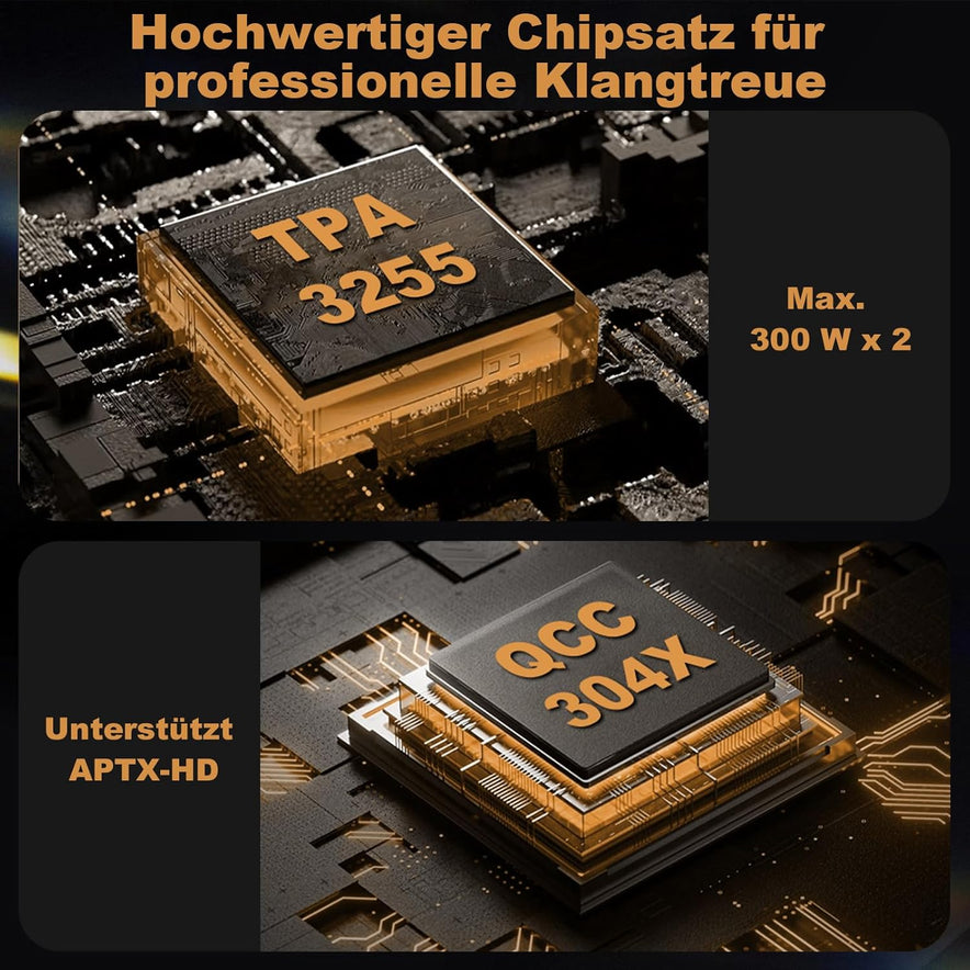 Bis zu 2×300 W Spitzenleistung für kraftvollen, dynamischen Klang mit kristalliner Klarheit.
