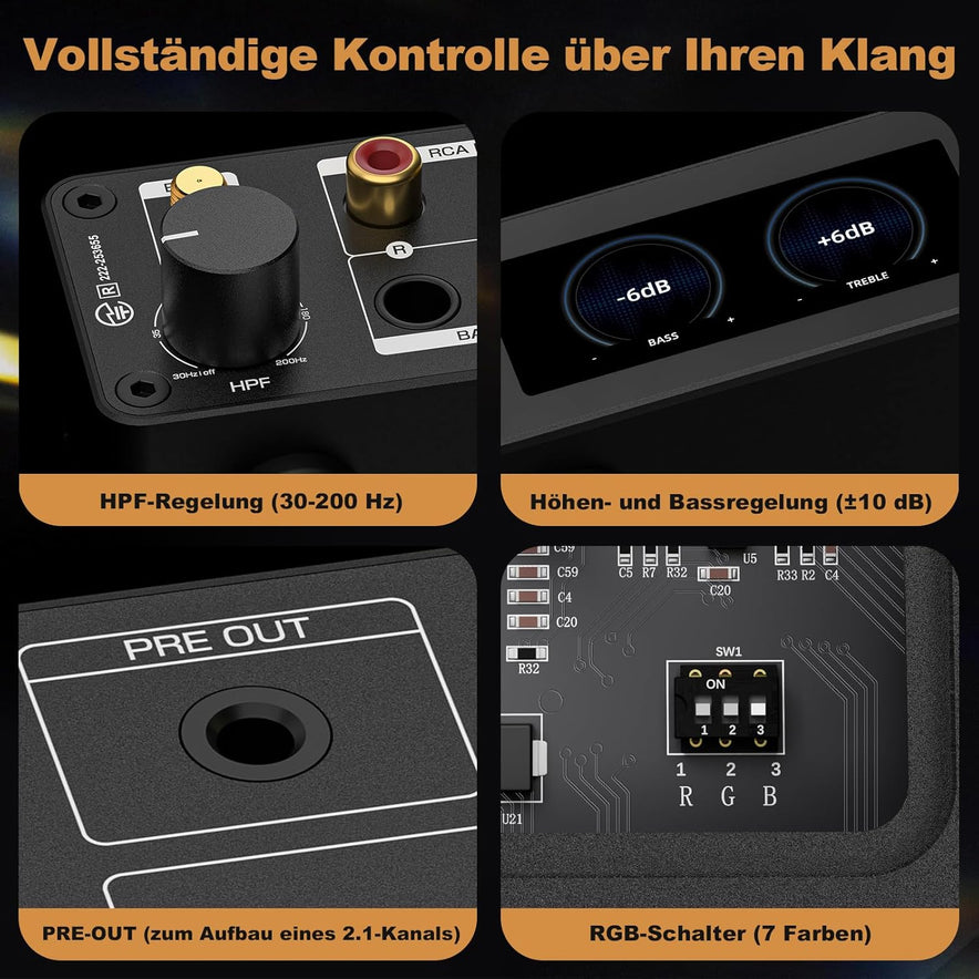 - Für den Alltag optimiert: 12-V-Trigger, Infrarot-Fernbedienung, One-Touch-Stummschaltung und Bluetooth-Reset vereinfachen Ihr Setup. Stimmen Sie Ihren Klang mit der ±10 dB-Klangregelung fein ab; die interne RGB-Beleuchtung sorgt für eine edle, moderne Atmosphäre. Reibungsloser Betrieb von Anfang bis Ende.