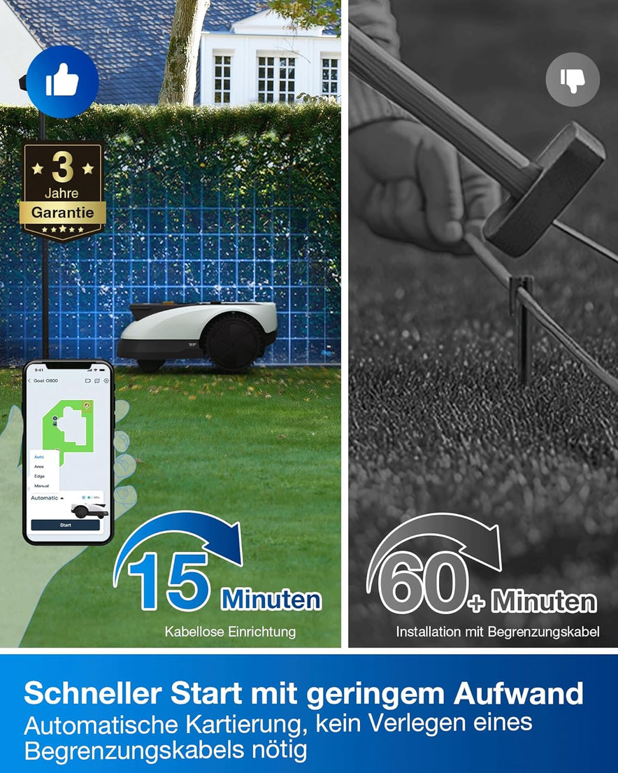 - Vollautomatische Kartierung: Der innovative GOAT Rasenmäher kartiert den Garten, in dem er alle Arten von Begrenzungen erkennt und automatisch definiert, ohne physische Markierungen zu benötigen. Diese nahtlose Integration ermöglicht eine schnelle und einfache Einrichtung und garantiert eine präzise und personalisierte Gartenkarte für optimale Mähergebnisse.