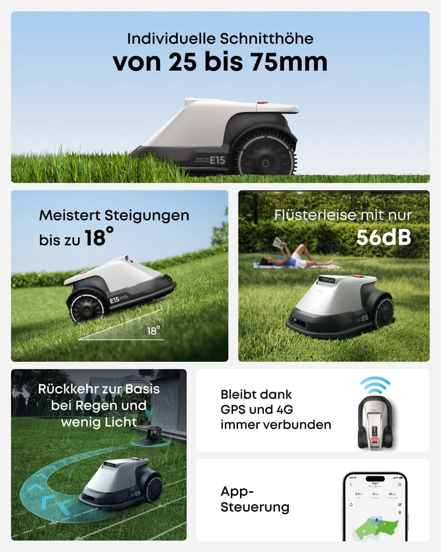 - Präzise Hinderniserkennung: Dank TrueVision erkennt der Mähroboter E15 nicht nur Bäume, Möbel oder Pools, sondern auch Haustiere und kleine Wildtiere wie Igel zuverlässig. So bleibt dein Garten sicher, während der Mähvorgang reibungslos abläuft.