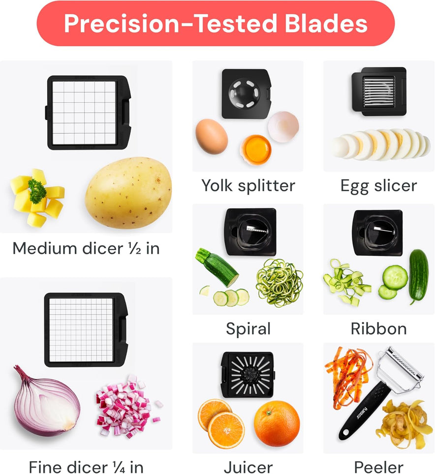 - Einfache Essensvorbereitung mit rostbeständigen Klingen - ideal für alle, die sich gesünder ernähren möchten, aber wenig Zeit haben; Würfeln Sie Kartoffeln, Tomaten, Gurken, Karotten und mehr mit robusten, rostfreien Klingen aus 420er Edelstahl, die dauerhaft scharf bleiben