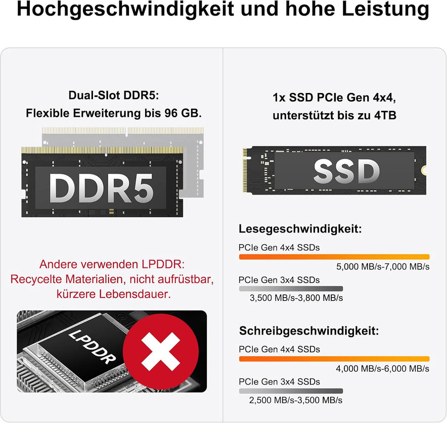 - 【𝐁𝐥𝐢𝐭𝐳𝐬𝐜𝐡𝐧𝐞𝐥𝐥 𝐑𝐀𝐌 & Ü𝐩𝐩𝐢𝐠𝐞𝐫 𝐒𝐩𝐞𝐢𝐜𝐡𝐞𝐫】Der A6 setzt auf hochwertigen, nachrüstbaren 𝐃𝐃𝐑𝟓-𝐑𝐀𝐌 und verzichten auf fest verlöteten LPDDR-Speicher, der oft aus recyceltem Material gefertigt wird und unter schlechterer Stabilität sowie kürzerer Lebensdauer leidet. Die Basis bilden 16 GB DDR5 (bis 96 GB erweiterbar) und eine 1 TB PCIe 4.0 SSD (bis 4 TB erweiterbar). Ein zusätzlicher M.2-Slot (bis 𝟏 𝐓𝐁) ermöglicht 𝐦𝐚𝐱𝐢𝐦𝐚𝐥𝐞 𝐁𝐚𝐧𝐝𝐛𝐫𝐞𝐢𝐭𝐞 𝐮𝐧𝐝 𝐦𝐢𝐧𝐢𝐦𝐚𝐥𝐞 𝐋𝐚𝐭𝐞𝐧𝐳 für ultraschnelle Datenübertragungen, wodurch die gesamte Systemleistung optimal gesteigert wird.