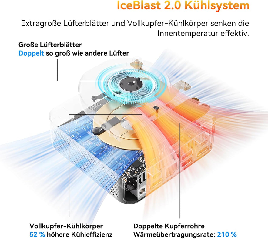 - 【𝐈𝐜𝐞𝐁𝐥𝐚𝐬𝐭 𝐊ü𝐡𝐥𝐮𝐧𝐠 𝐞𝐧𝐭𝐟𝐞𝐬𝐬𝐞𝐥𝐭】Das GEEKOM IceBlast 2.0 Kühlsystem verkörpert Ingenieurskunst: Hochleistungs-Kupfer-Wärmepipen (Dual-Phase) für 210% besseren Wärmeübergang, ein maßgefertigter, doppelt so großer und leiser Lüfter wie bei andere Marken sowie ein vernickelter Kühlkörper im Direktkontakt mit der CPU. Desktop-Kühlleistung für den kompakten A6 Mini Computer!