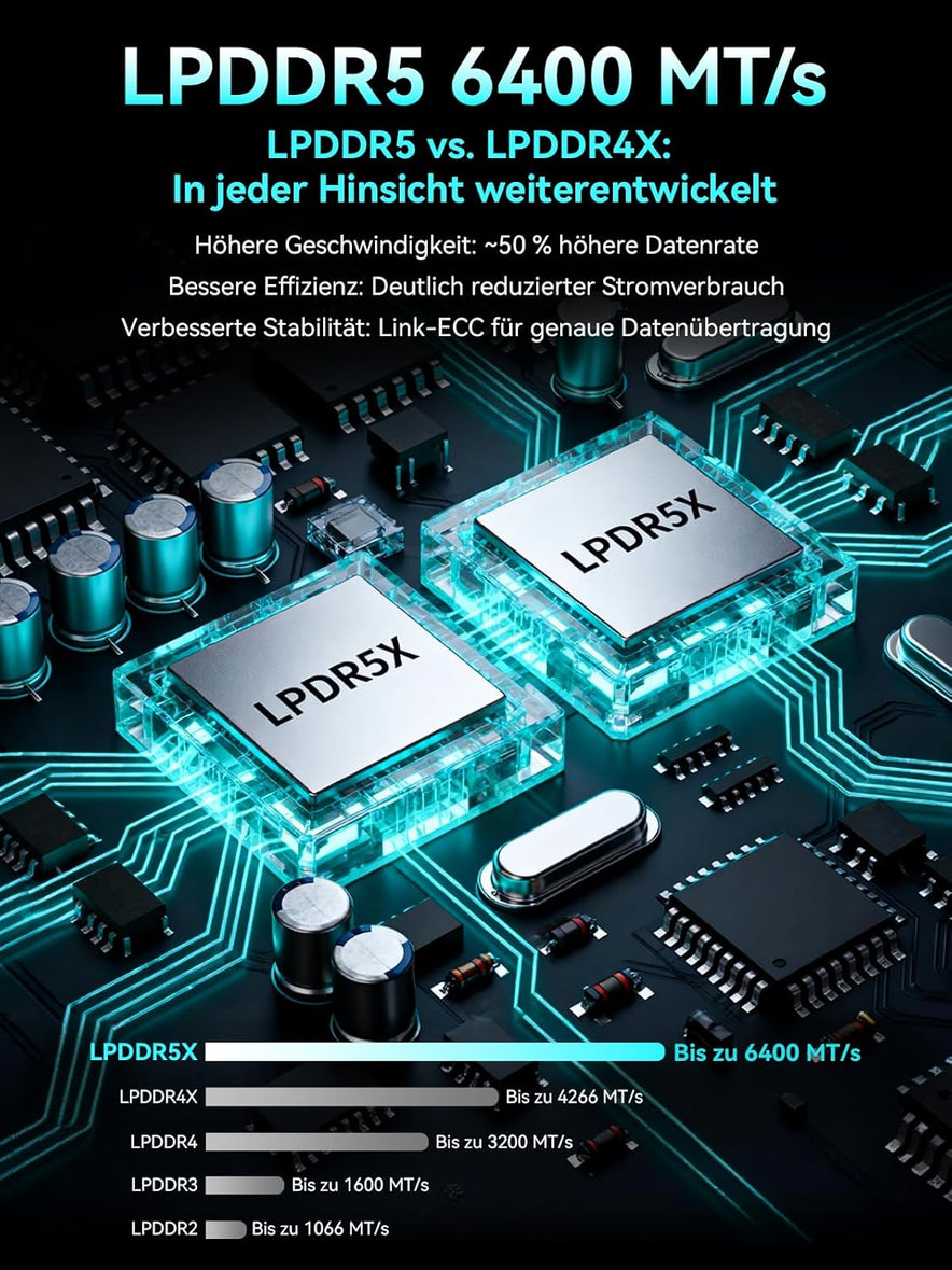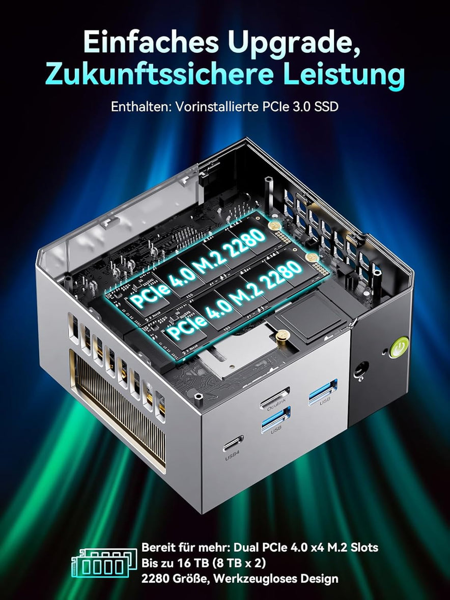 - 16GB LPDDR5-6400 RAM & 1TB PCIe SSD – hohe Bandbreite für moderne Mini-PCs mit 16GB LPDDR5-6400 RAM bietet das System eine deutlich höhere Speicherbandbreite als herkömmlicher DDR4/DDR5-SO-DIMM (teils mehr als 50 % höhere Transferraten), bei gleichzeitig geringerem Energieverbrauch – ideal für kompakte Mini-PCs. Die 1TB M.2 SSD erfüllt die Anforderungen der meisten Nutzer vollständig. Zusätzlich werden 2× PCIe Gen4 x4 SSDs (max. 16TB) unterstützt.