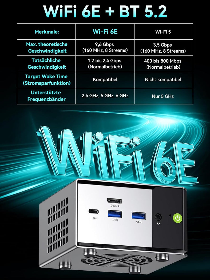 - OCULINK-ANSCHLUSS – Der OCuLink-Port des M8 Mini PC Gaming bietet eine höhere Bandbreite, flüssigere Bildraten und geringere Latenz dank PCIe-x4-Geschwindigkeit und übertrifft damit den Thunderbolt-x3-Standard. Er unterstützt vollständig NVIDIA-Grafikkarten der RTX- und GTX-Serie und ist ideal für eGPU-Setups. Gamer und Content Creator profitieren von besserer Grafikleistung, weniger Verzögerung und einer stabileren externen GPU-Nutzung.