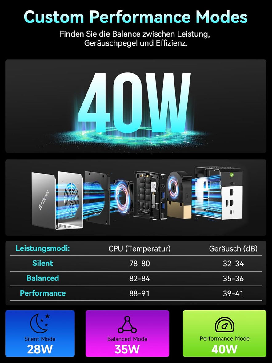 - DREI LEISTUNGSMODI & AKTUALISIERTES BIOS – Der M8 mini pc verfügt über ein komplett neues BIOS-Update mit drei Leistungsmodi (Leise 28W, Ausgewogen 35W oder Leistung 40W). VRAM-Zuweisung ist ebenfalls möglich, mit Optionen wie Auto Power On und Wake-on-LAN.
