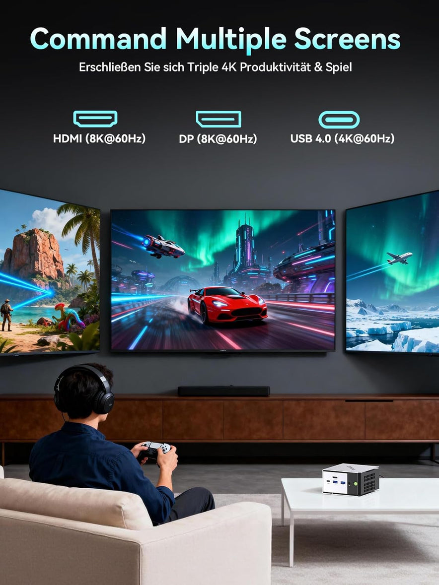 - MICRO PC MIT QUAD-DISPLAY – Nucbox M8 ist ausgestattet mit Dual USB4 USB-C Videoausgängen. Der neueste HDMI 2.1-Port kann an große Fernseher und Bildschirme angeschlossen werden und unterstützt eine Ausgabe von bis zu 8K@60Hz. Der Type-C DisplayPort-Videoausgang kann an die neuesten Monitore angeschlossen werden und unterstützt 4K@144Hz. Unterstützt gleichzeitige Vier-Bildschirm-Anzeige.