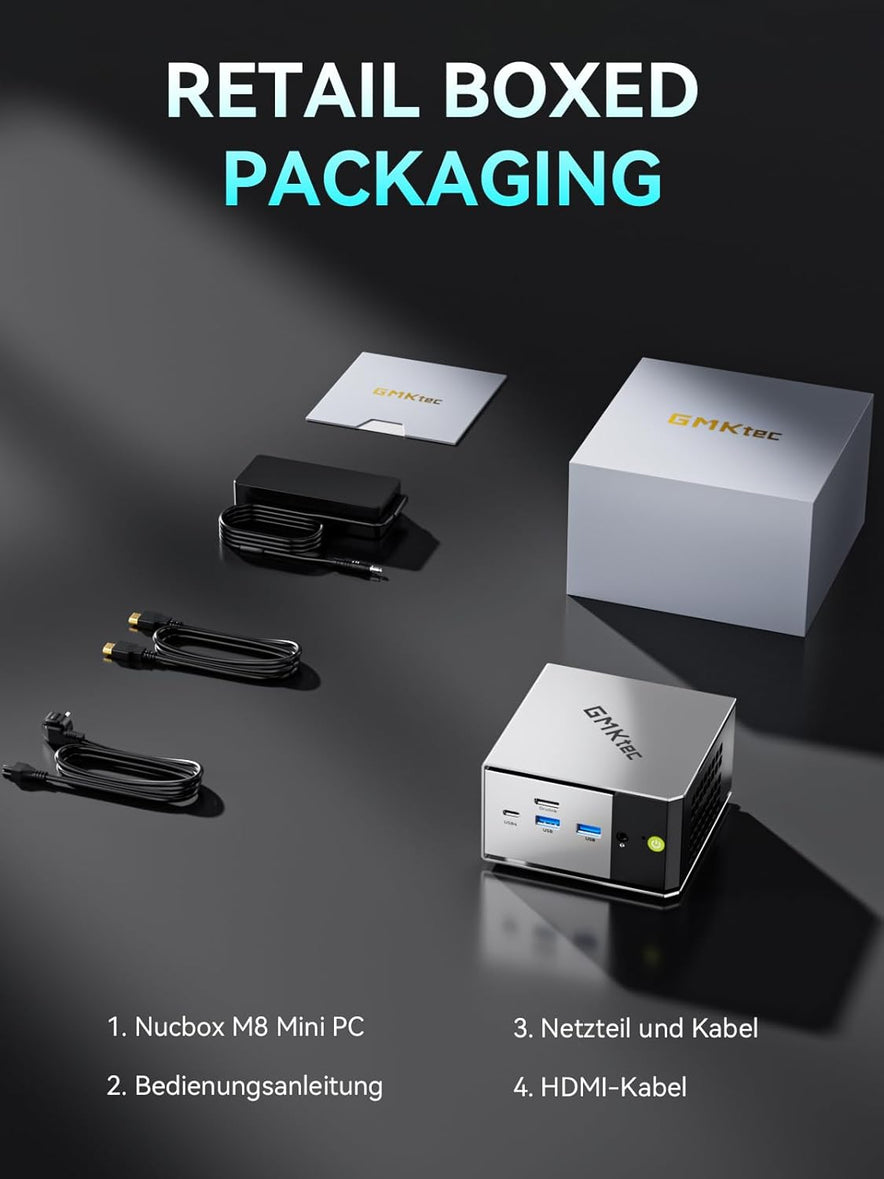 | Lieferumfang | 1x GMKtec Nucbox M8 AMD Ryzen 5 PRO 6650H Mini PC, 1x Netzteil, 1x HDMI-Kabel, 1x Handbuch |