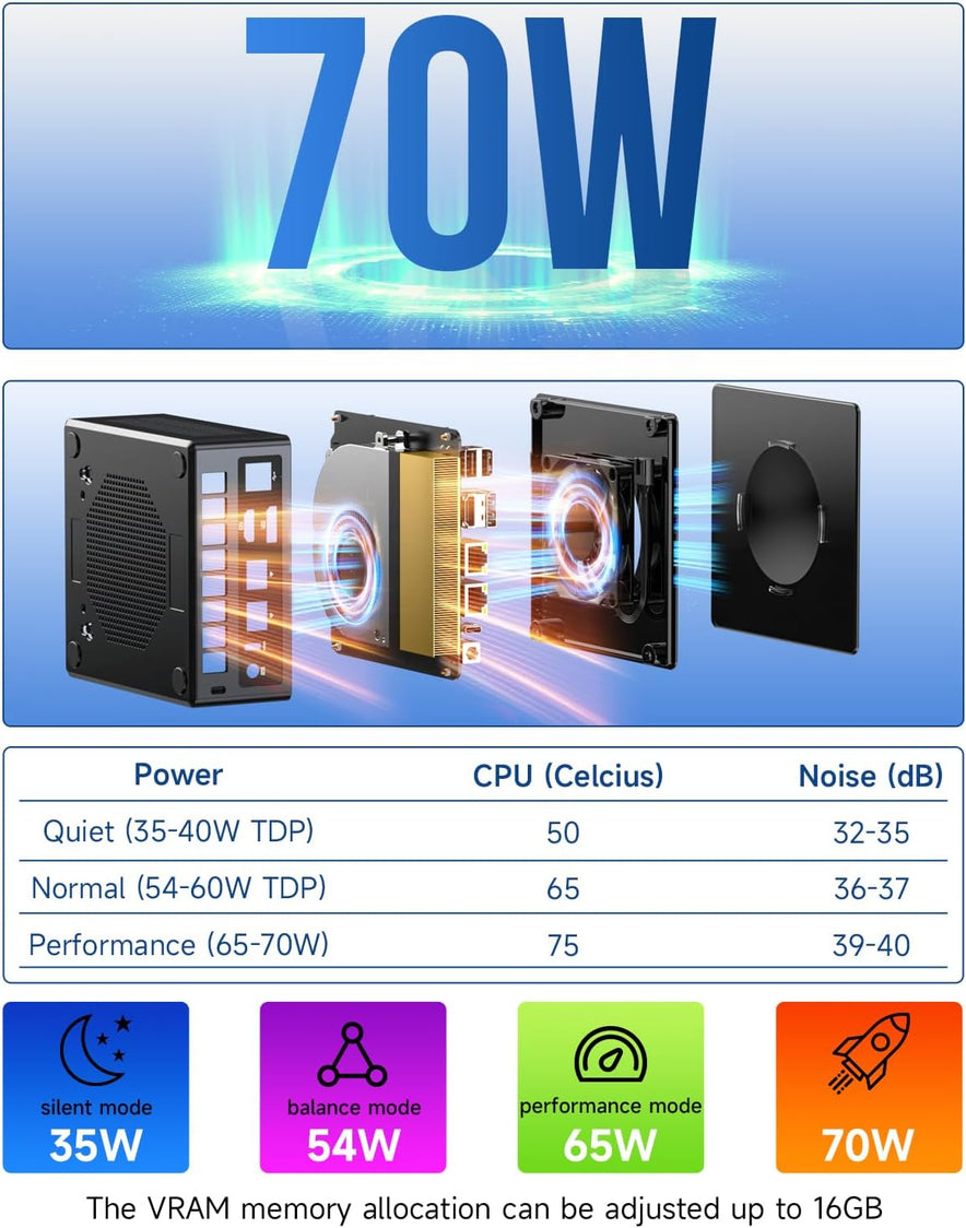 - 【Three Performance Modes】Featuring three customizable performance modes: Silent mode (35W), Balanced mode (54W), and Performance mode (65W, peak 70W). This flexibility ensures that you can optimize for either silent operation or maximum performance depending on your workload