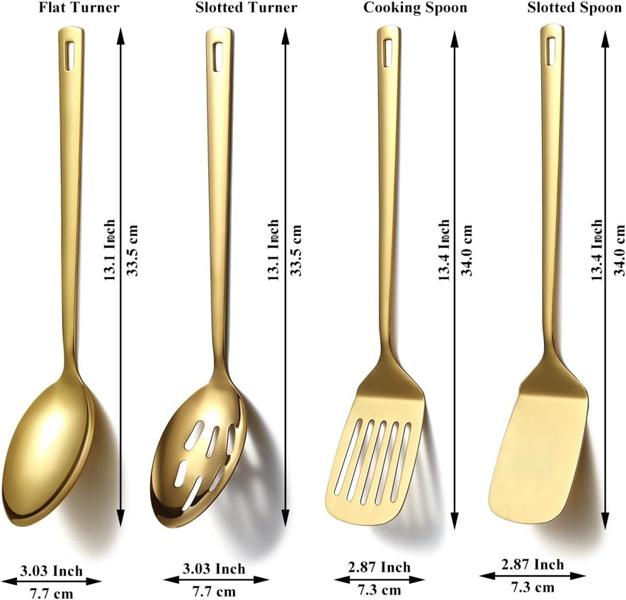 - Elegante Titanium-Goldbeschichtung: Jedes Stück dieses 4-teiligen Sets verfügt über eine luxuriöse Vakuum-Titan-Gold-Galvanisierung, die jeder Küche einen Hauch von Opulenz verleiht. Ideal für Hochzeiten, gehobene Restaurants oder den täglichen Gebrauch zu Hause - diese Utensilien werten Ihr Kocherlebnis mit ihrer raffinierten Ästhetik sofort auf.