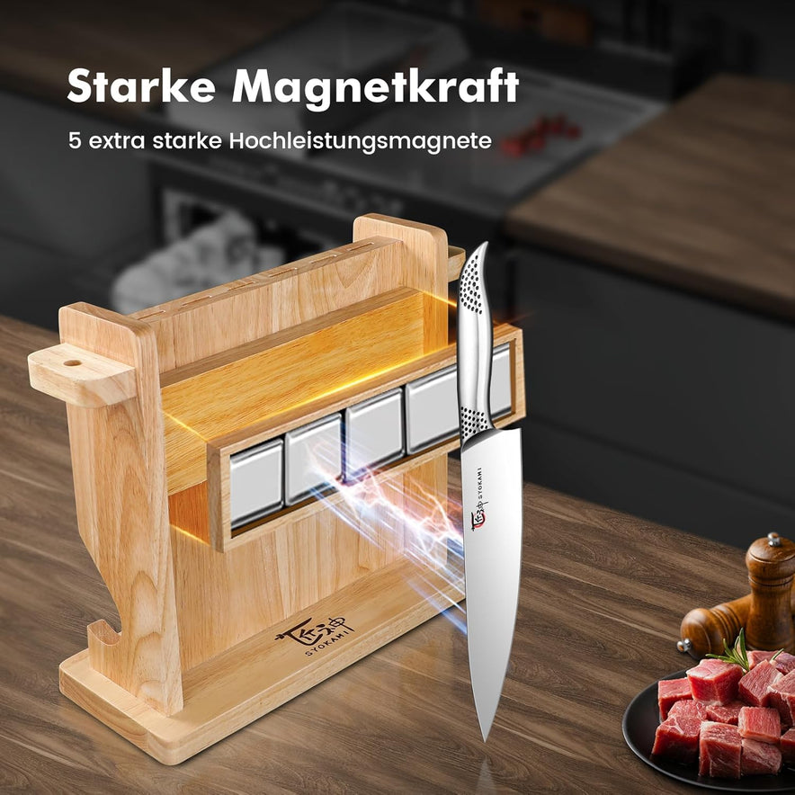 - Leistungsstarker magnetischer Messerblock: Dank starker Magnetkraft hält dieser Messerblock Ihre Messer sicher an ihrem Platz und sorgt so für einfachen Zugriff und eine elegante Präsentation. Schluss mit unordentlichen Schubladen – Ihre Lieblings-Kochmesser sind stets übersichtlich, ordentlich aufbewahrt und griffbereit.