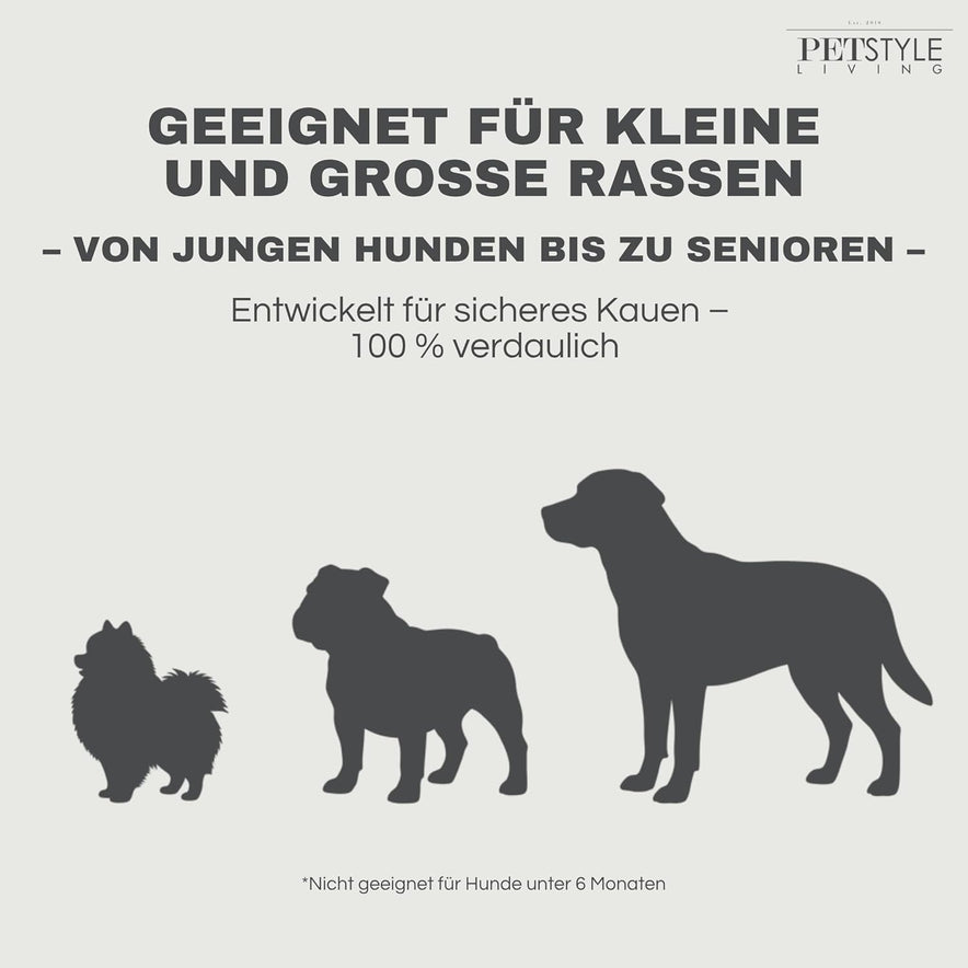 - Vollständig verdaulich - Alle Petstyle Living Snacks sind 100 % verdaulich. Zur Sicherheit Ihres Hundes empfehlen wir, den Hund nach dem Verzehr von Snacks stets zu beobachten und frisches Wasser zu geben.