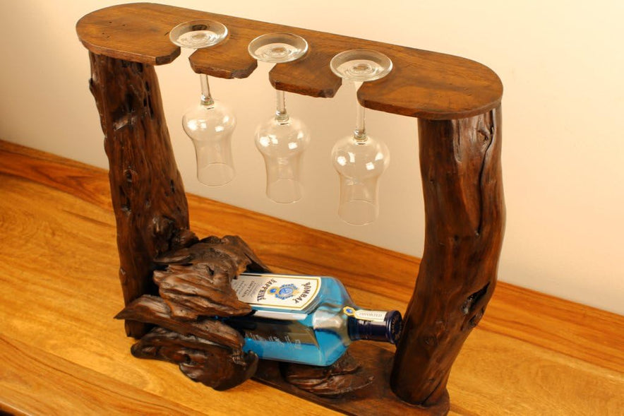 - Maße & Material – Handgefertigt aus massivem Teakholz und Wurzelholz. Maße je nach Modell ca. 40x40x15cm, robust und standfest. Varianten für 1 Flasche und 2-3 Gläser erhältlich.