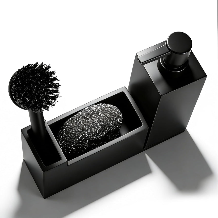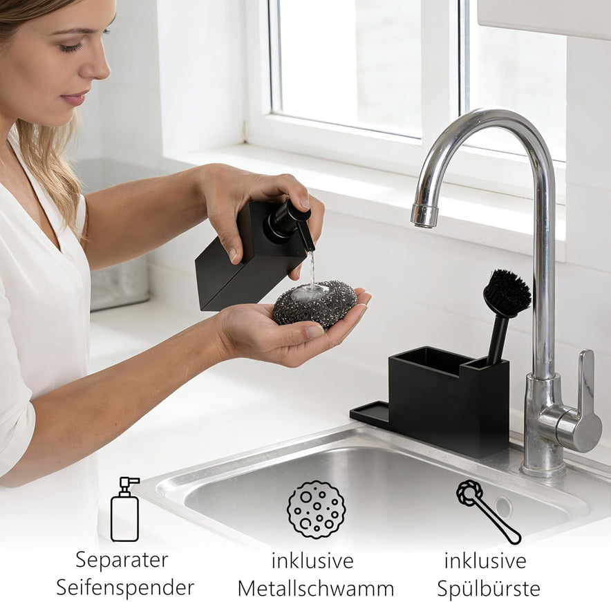- Spüle Organizer mit separatem Seifenspender - Unser Spülmittel Organizer enthält einen entnehmbaren Spülmittelspender, eine passende Bürste und einen Metallschwamm – alles in stilvollem Schwarz gehalten, für eine schicke Küchenorganisation