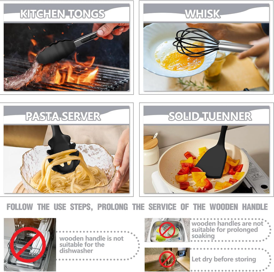 Küchenutensilien-Set – 34-Teiliges Silikon-Kochutensilien Mit Halter, Hitzebeständig, Antihaftbeschichtet, Kochgeschirr, Zange, Spatel, Löffel-Set, Holzgriffe, Küchenutensilien Und Gadgets (Schwarz)