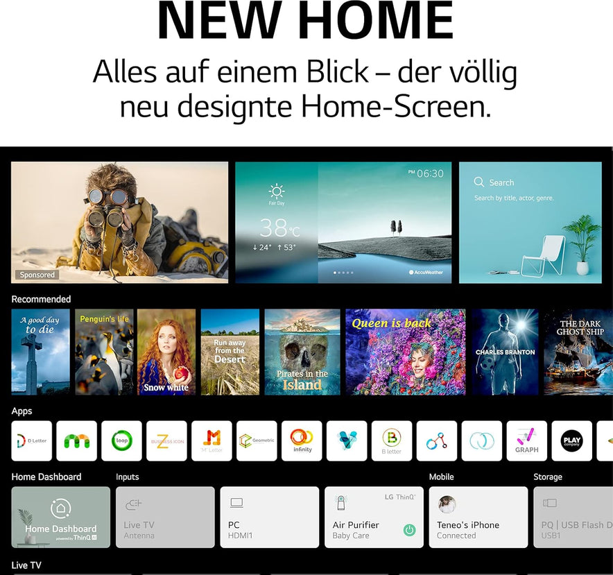 - Smart TV: webOS 6.0 (LG ThinQ) mit Google Assistant, Amazon Alexa und Apple AirPlay 2, Home Dashboard, inkl. Magic Remote-Fernbedienung