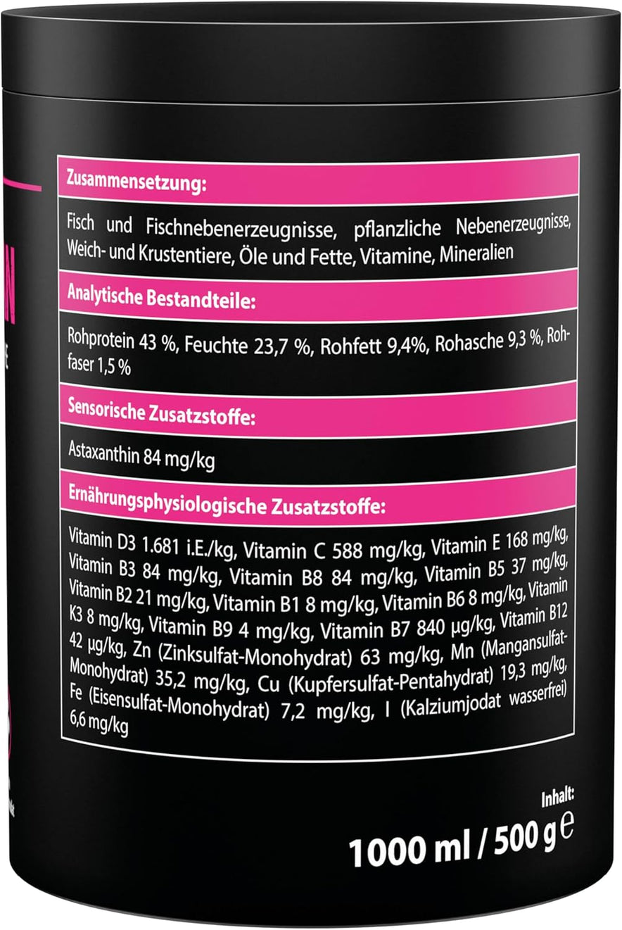 Zutaten: Fisch und Fischnebenerzeugnisse, pflanzliche Eiweißextrakte, pflanzliche Nebenerzeugnisse, Öle und Fette, Hefe, Weich- und Krustentiere, Algen, Mineralien, Vitamine. Analytische Bestandteile: Rohprotein 48,8 %, Feuchte 17 %, Rohfett 10 %, Rohasche 7,7 %, Rohfaser 1,6 %. Ernährungsphysiologische Zusatzstoffe: Vitamin A 26.250 i.E./kg, Vitamin D3 1.575 i.E./kg, Vitamin C 382 mg/kg, Vitamin E 101 mg/kg, Fe (Eisen(II)-Sulfat-Monohydrat) 27 mg/kg, Zn (Zinkoxid) 7,5 mg/kg, Mn (Mangan(II)-oxid) 5,6 mg/kg, Cu (Kupfer(II)-sulfat-Pentahydrat) 1,3 mg/kg, I (Kaliumiodid) 0,16 mg/kg