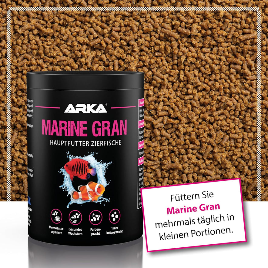 - MARINE GRAN: Ein kaltgepresstes Hauptfutter für Zierfische in jedem Meerwasseraquarium. Dank der qualitativ sehr hochwertigen Inhaltsstoffe, wird die Gesundheit und Vitalität sowie der Stoffwechsel und das Wachstum der Meerwasserfische gefördert.
