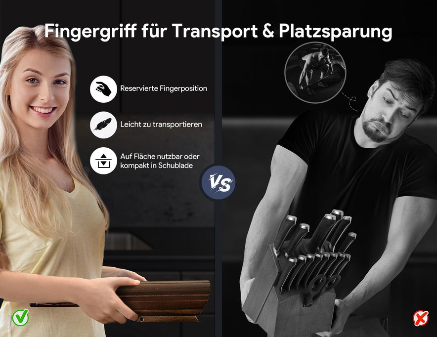 - SCHÄFTER, GLATTER, SUPERIOR: Dieses Küchenmesser-Set besteht aus kohlenstoffreichem Edelstahl mit einer Rockwell-Härte-Skala von 56+, gebaut für Spitzenleistungen. Handgeschliffen, um eine gestochen scharfe 15-Grad-Kante zu erzielen, ist jeder Schnitt ein Meisterwerk. Der Messersetblock besteht aus Akazienholz, das feuchtigkeits- und korrosionsbeständig ist. Das ergonomische Griffdesign sorgt für einen komfortablen Halt