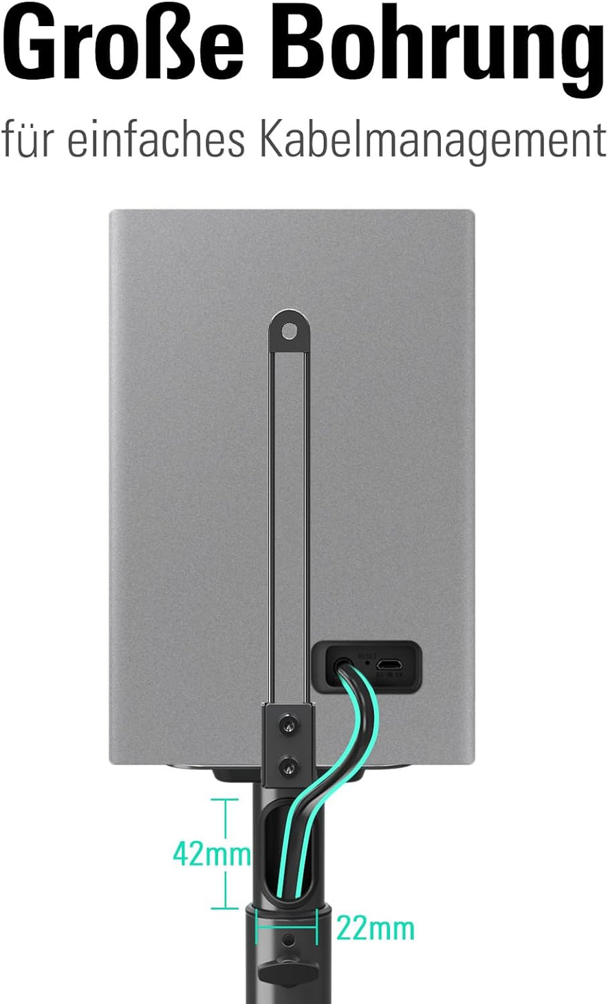 - Die Ständer verbergen die Kabel mit Hilfe des Lochs (2,2 cm B x 4,2 cm H) für das Kabelmanagement.