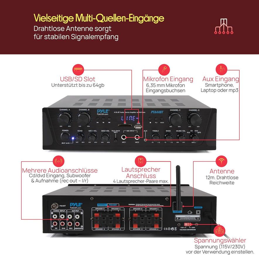 - Einfache Bedienung mit EQ & Fernbedienung Präzise Regler für Bass, Höhen, Lautstärke und Mikrofon-Echo. Quellenwahl und Klangsteuerung bequem per Drehregler oder mitgelieferter Fernbedienung – ideal für Fernzugriff.