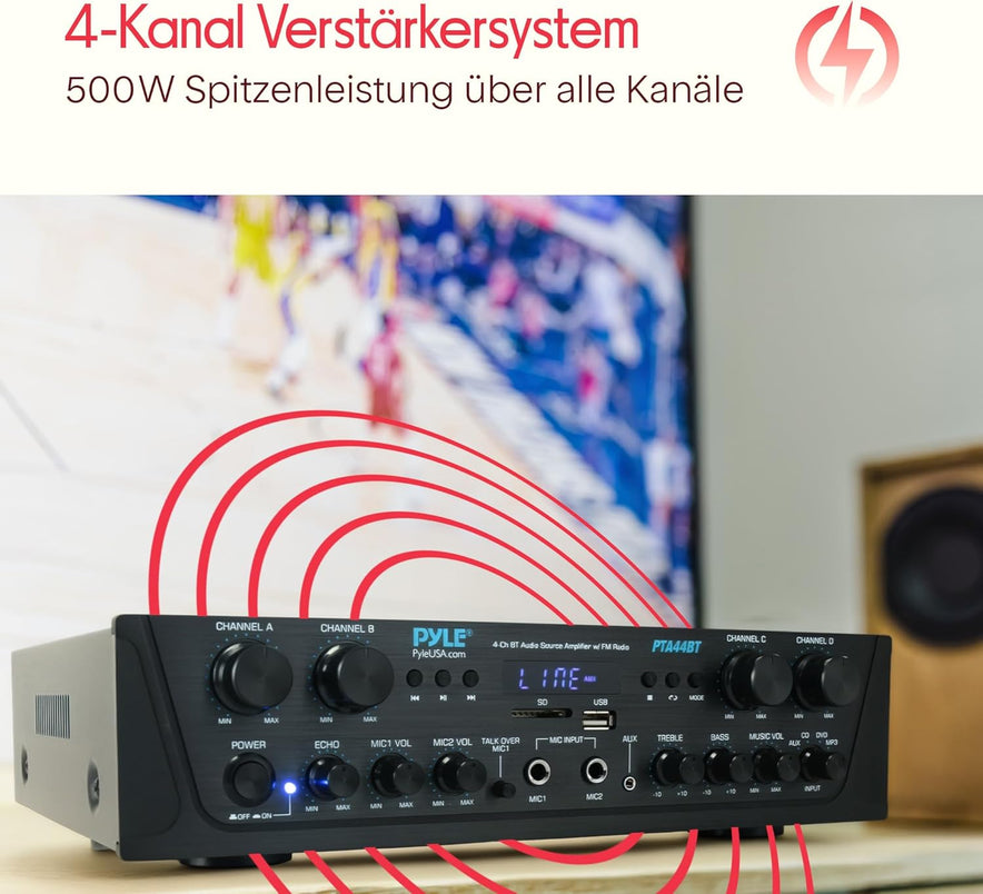 - 500 W Ausgangsleistung für kraftvollen Sound Ideal für PA-Systeme oder Heimkino: Der 4-Kanal-Verstärker liefert bis zu 500 W Spitzenleistung und unterstützt Lautsprecher mit 4–8 Ohm – für klaren, raumfüllenden Klang bei Musik, Filmen oder Events.