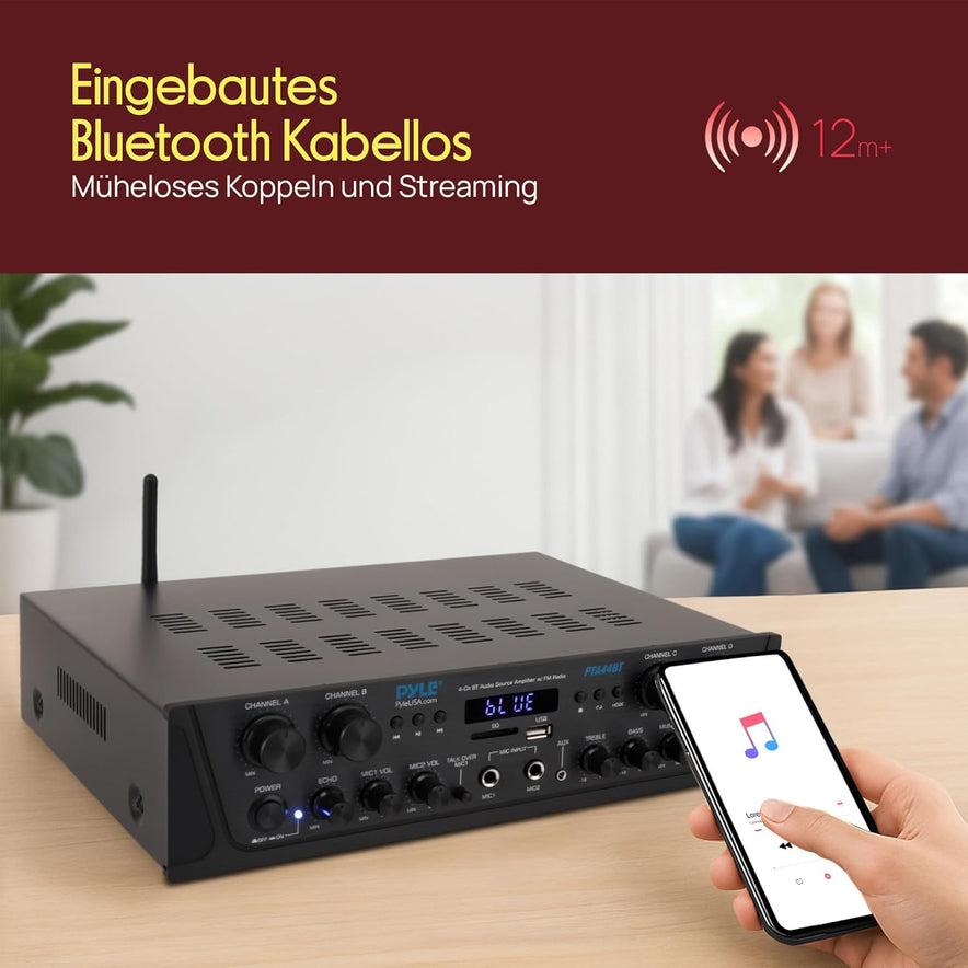 Pyle Bluetooth Stereo Verstärker 500 W – 4-Kanal Mini Receiver Mit USB, AUX, Fm-Radio, Subwoofer RCA & Mikrofoneingang Mit Echo Kabelloses Streaming, Für Heimkino, Studio & Pa-Anlage