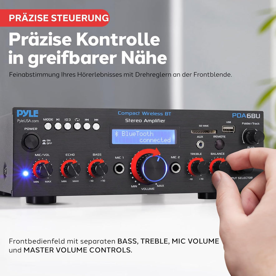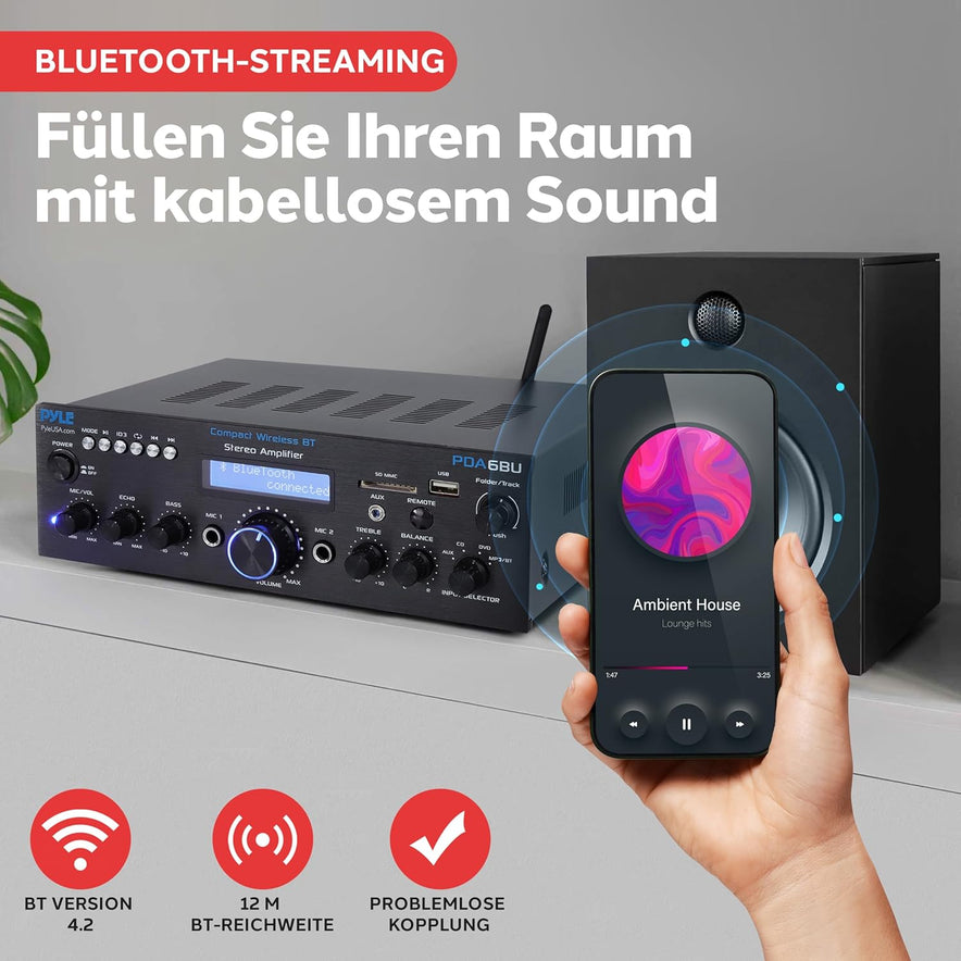 - 200 WATT LEISTUNG: Der 2-Kanal Pyle Bluetooth Stereo Verstärker Receiver ist ideal für Karaoke, Heimkino, HiFi-Anwendungen und Musik-Streaming. Mit einer Spitzenleistung von 200 Watt (100 Watt RMS) versorgt er zwei Lautsprecherpaare mit klarem, kraftvollem Klang für ein beeindruckendes Audioerlebnis.