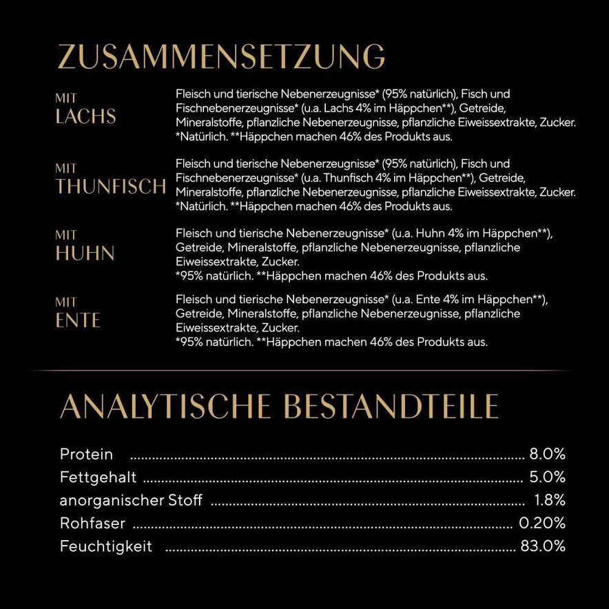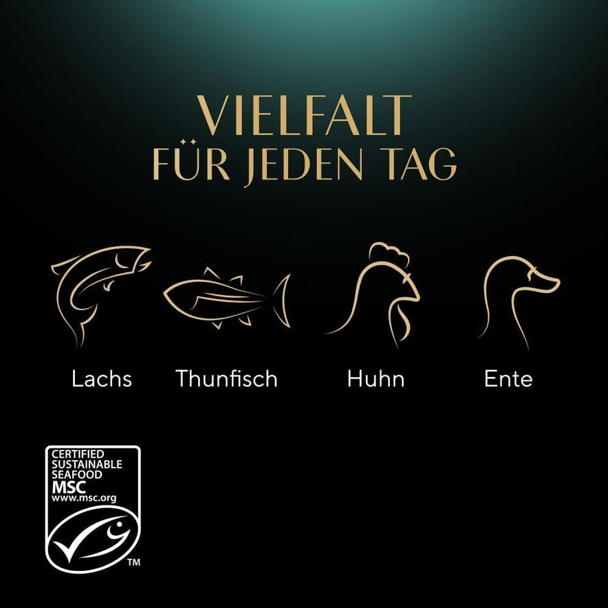 - Eine köstliche Auswahl mit Huhn, Ente, Lachs und Thunfisch mit extra Sauce; ohne künstliche Farb- oder Konservierungsstoffe