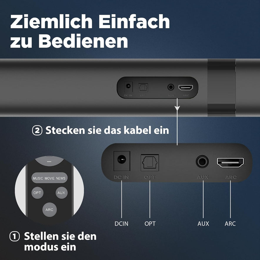 - Mühelose Einrichtung und Konnektivität: Die Installation unserer Bluetooth-Soundbar ist mühelos und bietet Kompatibilität mit optischen/ARC/AUX/Bluetooth Verbindungen für eine Vielzahl von Geräten, einschließlich der zuverlässigen Bluetooth 5.3 Option. Unsere TV Lautsprecher Soundbar wird mit einer detaillierten, bebilderten Anleitung, hilfreichen Video-Tutorials und allem wichtigen Montagezubehör geliefert, um den Einrichtungsprozess zu vereinfachen.