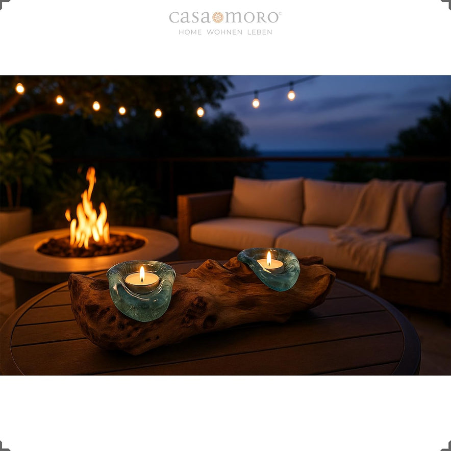 -25%Teelichthalter Glas Und Holz, Tisch Deko Wurzelholz Aus Teakholz Stamm Holzschale - 2Er Für Zwei Teelichter