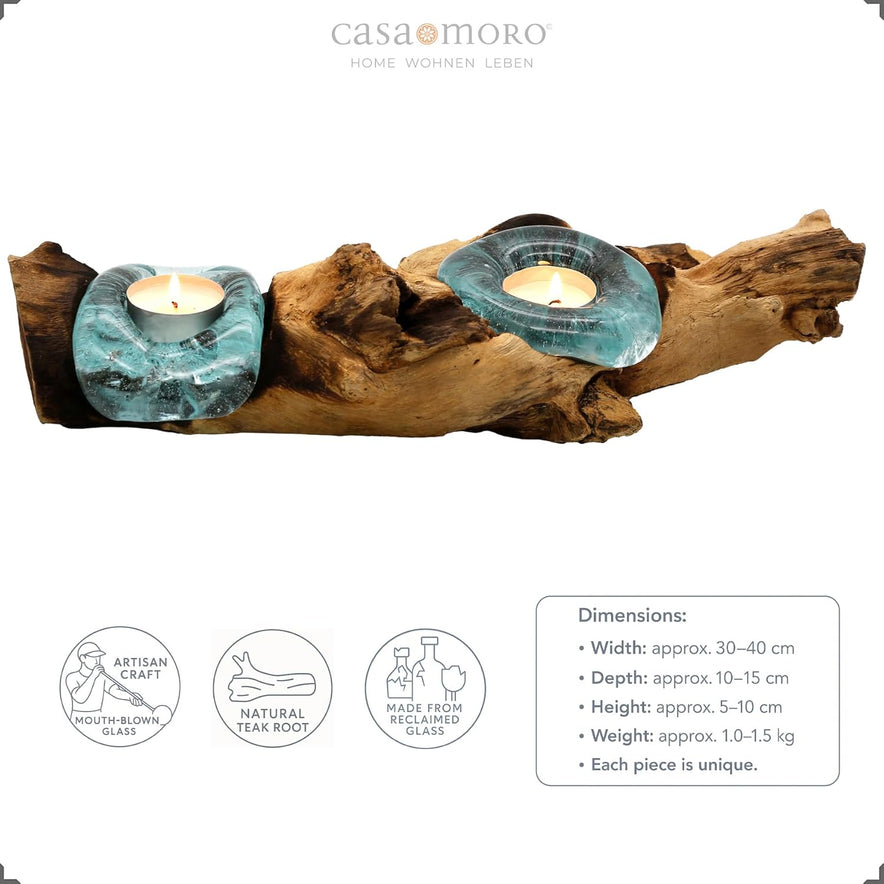 Teelichthalter Glas Und Holz, Tisch Deko Wurzelholz Aus Teakholz Stamm Holzschale - 2Er Für Zwei Teelichter
