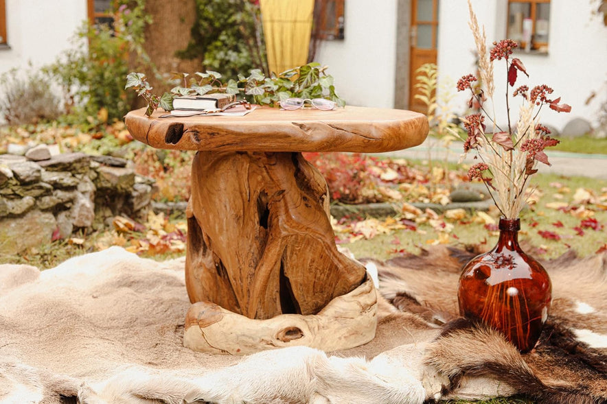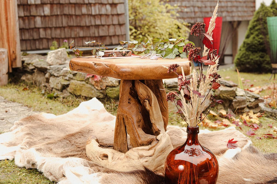 Die Meister der Holzschnitzkunst haben kunstvoll, die Natur in dem Beistelltisch ANCALAGON belassen.