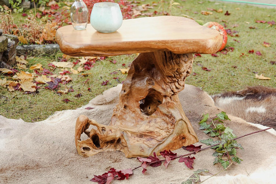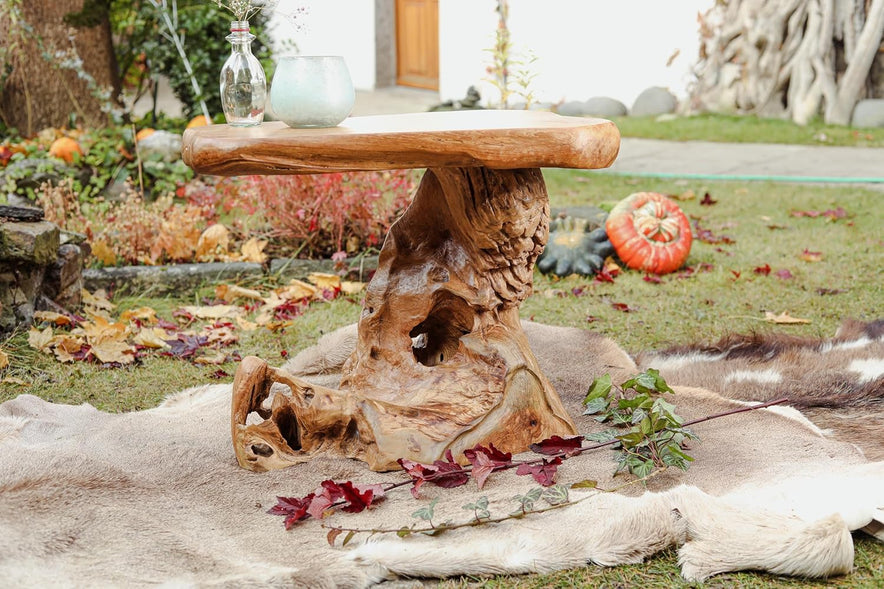 - Höhe: 50 cm | Breite: 61 cm | Tiefe: 42 cm | Gewicht: 21 kg | Tischplatte: 5 cm | Material: aus nachhaltigem Teak-Wurzelholz