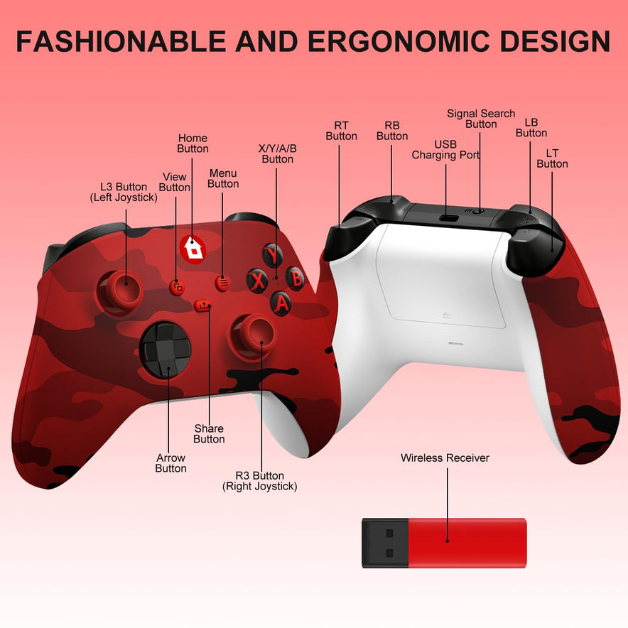Xbox Controller Wireless Für Xbox One, Xbox Series X/S, Xbox One X/S,Controller Mit 3.5Mm Kopfhörerbuchse,Mit 2.4Ghz Wireless Adapter,Camo Rot
